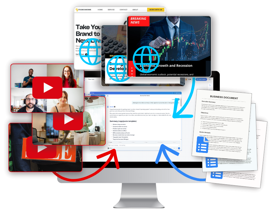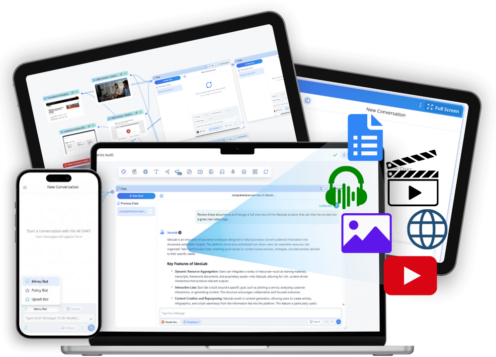 Unlike ChatGPT where you constantly re-upload the same documents, IdeoLab lets you connect YouTube videos, documents, podcasts, websites, and transcripts to your labs permanently. Upload your client's brand guidelines, strategic frameworks, past campaign results, and industry research once—then every conversation in that lab automatically pulls insights from those materials. Your recommendations aren't generic AI advice; they're grounded in your actual business materials, your client's specific situation, and the context you've built over time.