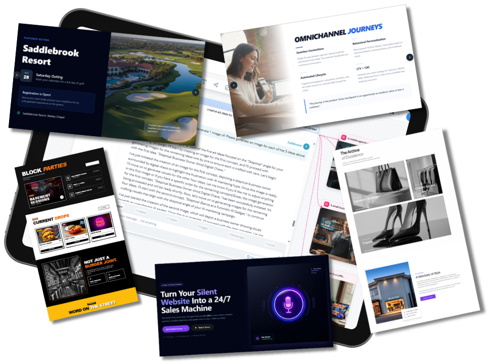You've just finished a productive strategy session in your lab. Now instead of opening Canva, Google Slides, and three other tools to create deliverables, you generate everything directly from that same conversation. Professional presentations with speaker notes, AI-powered landing pages, social media campaigns, custom images, mind maps, and strategic documents—all created from the context you've already built. No designers needed, no hours spent on execution, no starting over in different platforms. Everything from ideation to execution happens in your connected workspace.