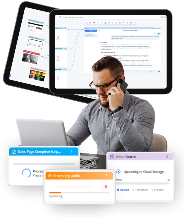 Upload YouTube videos, PDFs, websites, podcasts, audio files, and transcripts to any lab. IdeoLab processes everything and uses it to inform every AI response. Your client's brand guidelines, strategic frameworks, and past campaign results become an intelligent knowledge base that automatically grounds every recommendation in real business context.